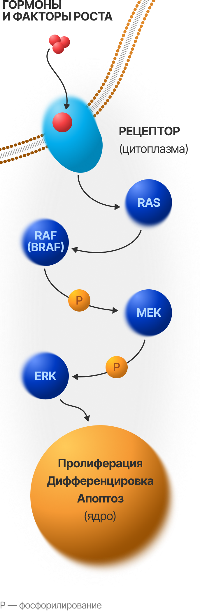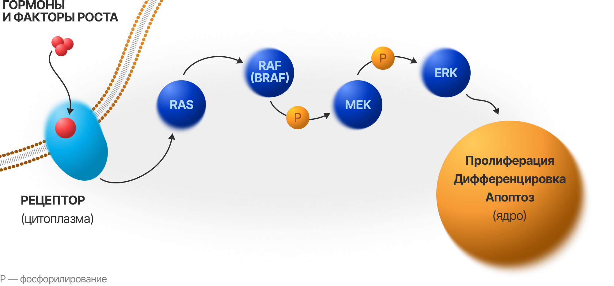 Этот каскад интересен тем, что с его избыточной активацией связывают развитие многих злокачественных новообразований. Аномальная активность каскада чаще всего развивается в результате мутаций белков RAS и RAF, причем мутации белка BRAF (одна из форм белка RAF) являются самыми распространенными из них и обладают значительным онкогенным потенциалом3.
