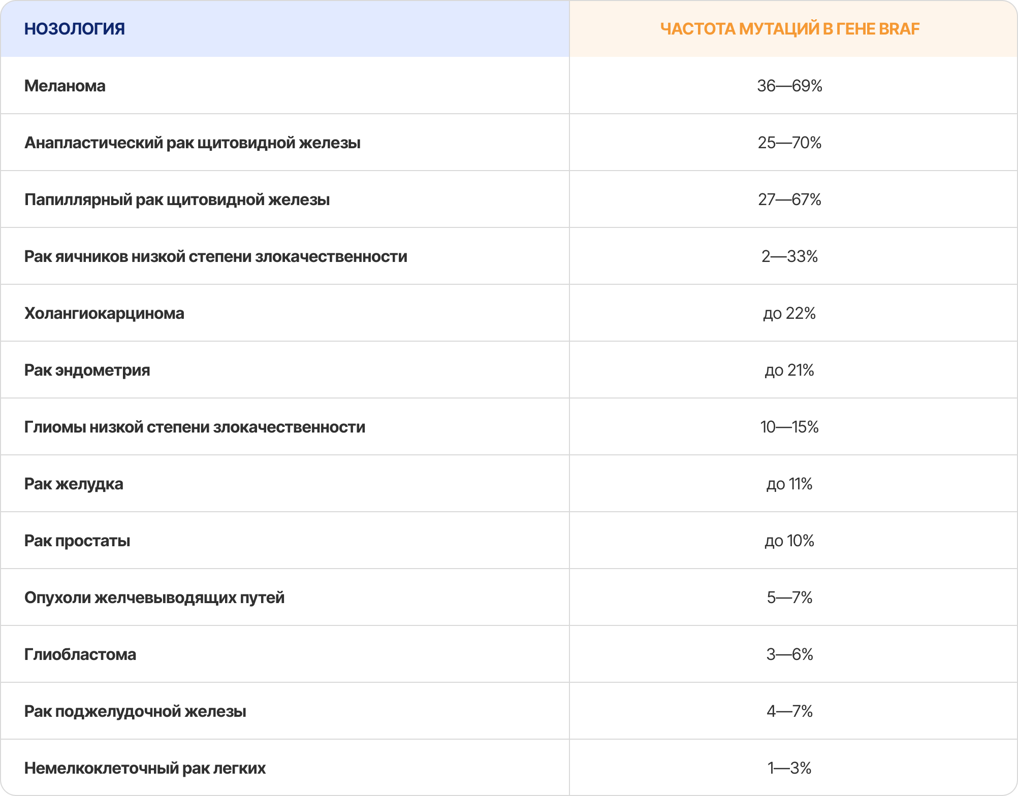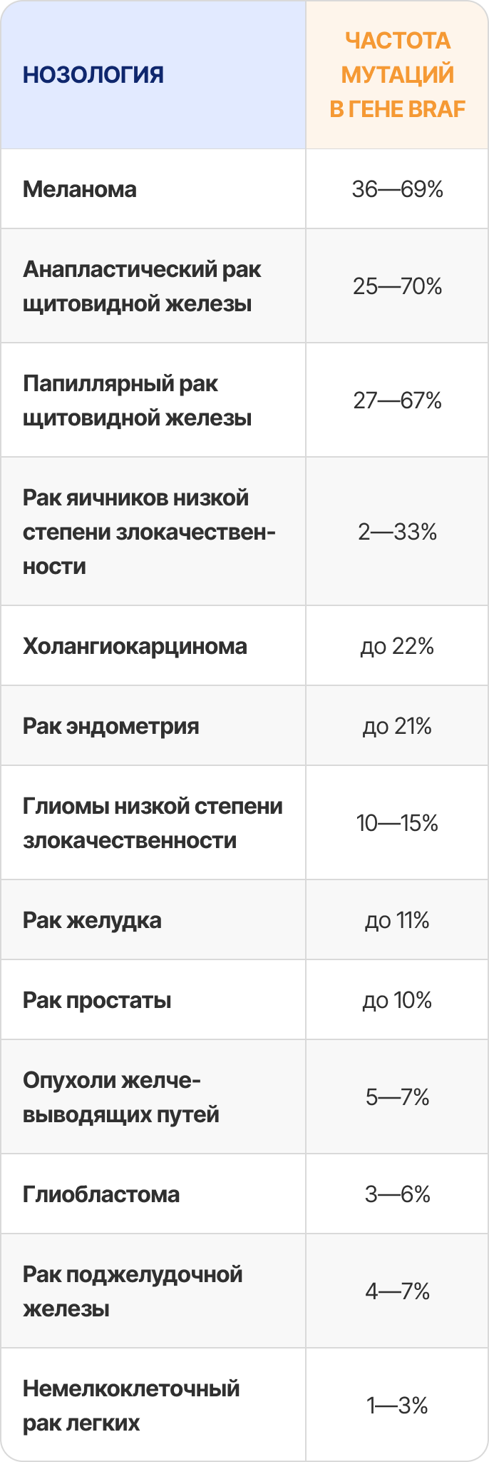 Исследования показывают, что мутации в гене BRAF не ограничиваются меланомой и встречаются в опухолях различных локализаций, наиболее часто при следующих нозологиях6—12: