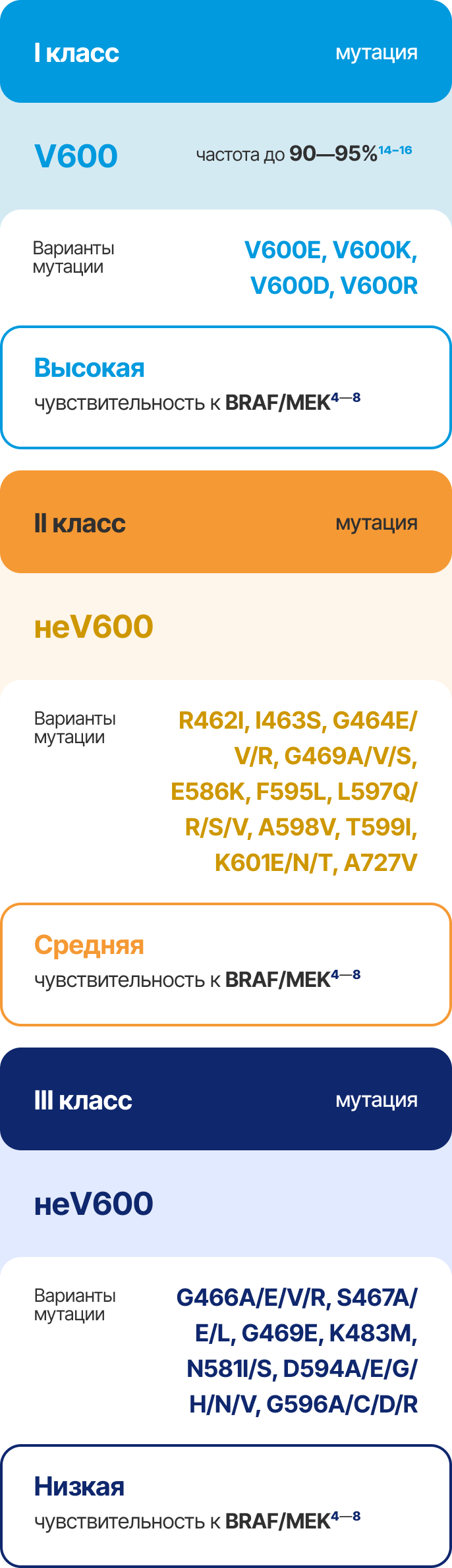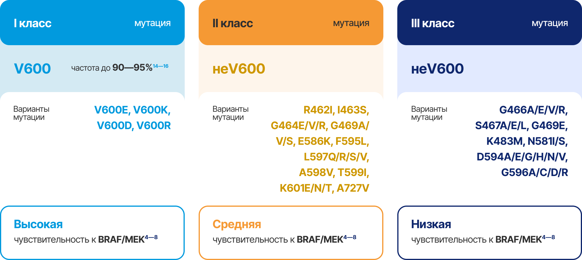 Хорошая новость состоит в том, что в целом большинство (до 90—95%) мутаций BRAF относится к I классу (V600), а мутации II и III классов являются довольно редкими14—16.