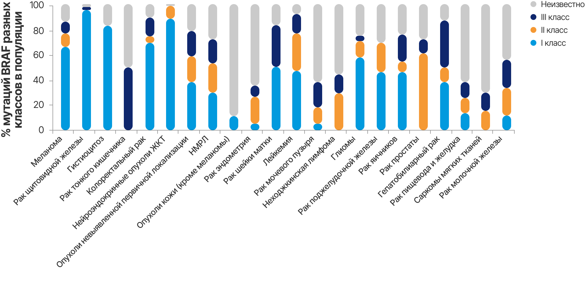 При разных нозологиях частота встречаемости мутаций в гене BRAF различных классов может значительно варьировать (рис. 2).