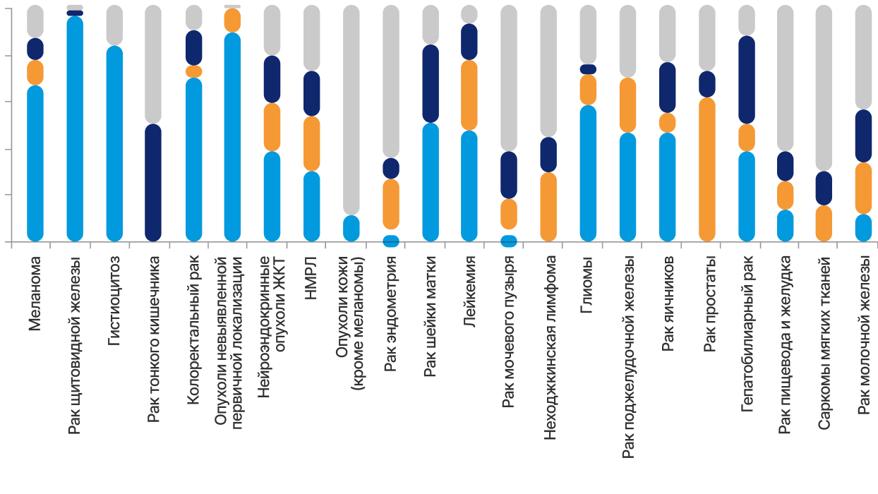 Мутации в гене BRAF встречаются в опухолях различных локализаций, в некоторых случаях с большой частотой (до 70%)6.
